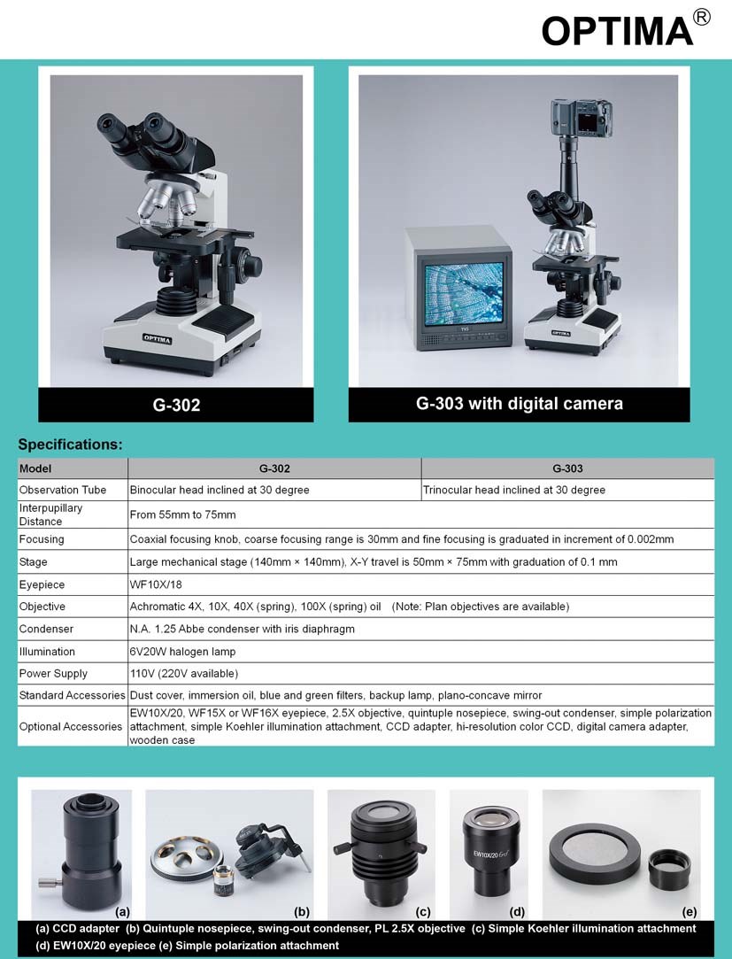 | 選購配件 | WF10X/18 帶測微尺目鏡,EW10X/20目鏡,WF16X目鏡,消色差20X、60X(S)物鏡,PL 2.5X物鏡,搖出式聚光鏡,五孔鼻輪,簡易偏光鏡組,轉盤式相位差套件,落射式螢光套件,CCD轉接鏡頭,數位相機成像鏡頭,USB影像擷取器 |